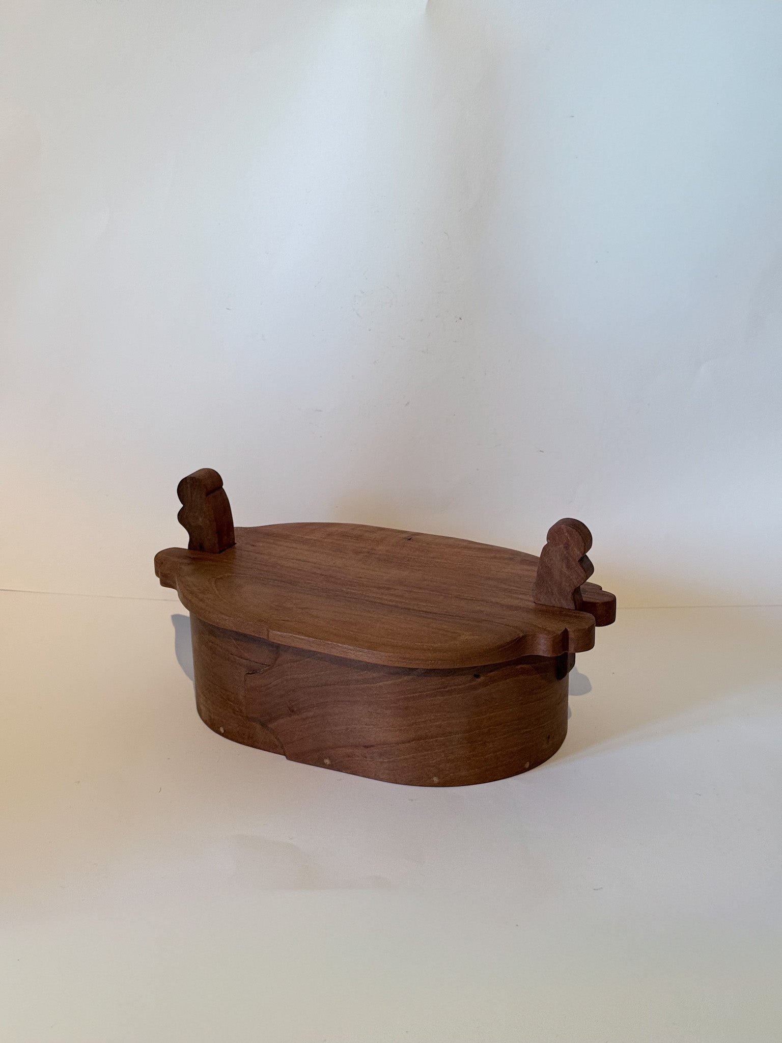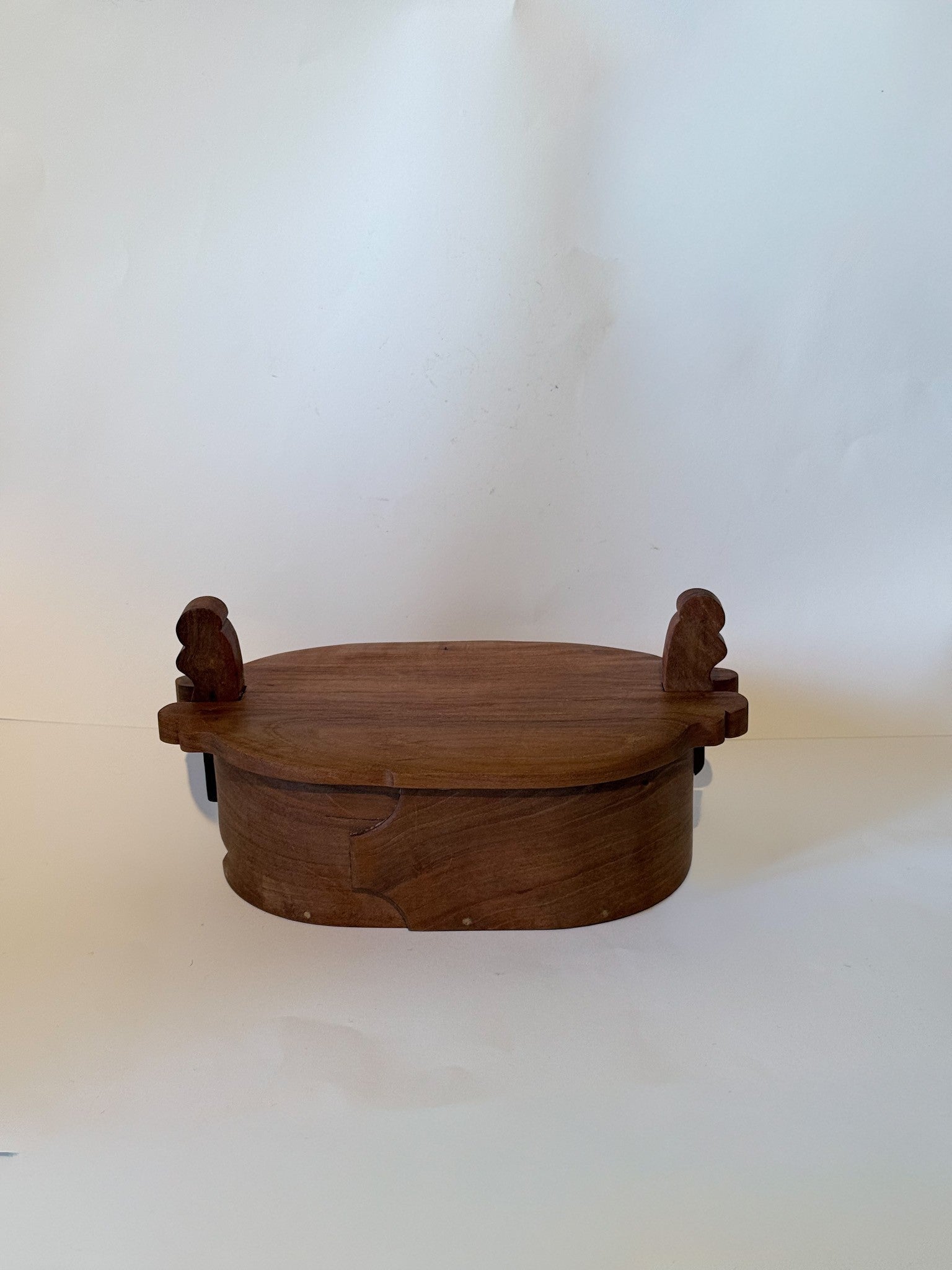 Vakker håndlaget tretine i Norsk lerk Dette er en tine i tre med unike detaljer på selve boksen. Tretinen har et avtagbart lokk, laget og signert vår trekunstner i 2006. Tretinen er 20 cm lang, bredden er 12 cm og høyden 10 cm. Laup i tre er et annet ord for tine i tre, og ble brukt for oppbevaring av matvarer, spesielt smør. Denne vakre tretinen passer perfekt til å oppbevare bunadsmykker, knapper eller som et vakkert interiør-element.