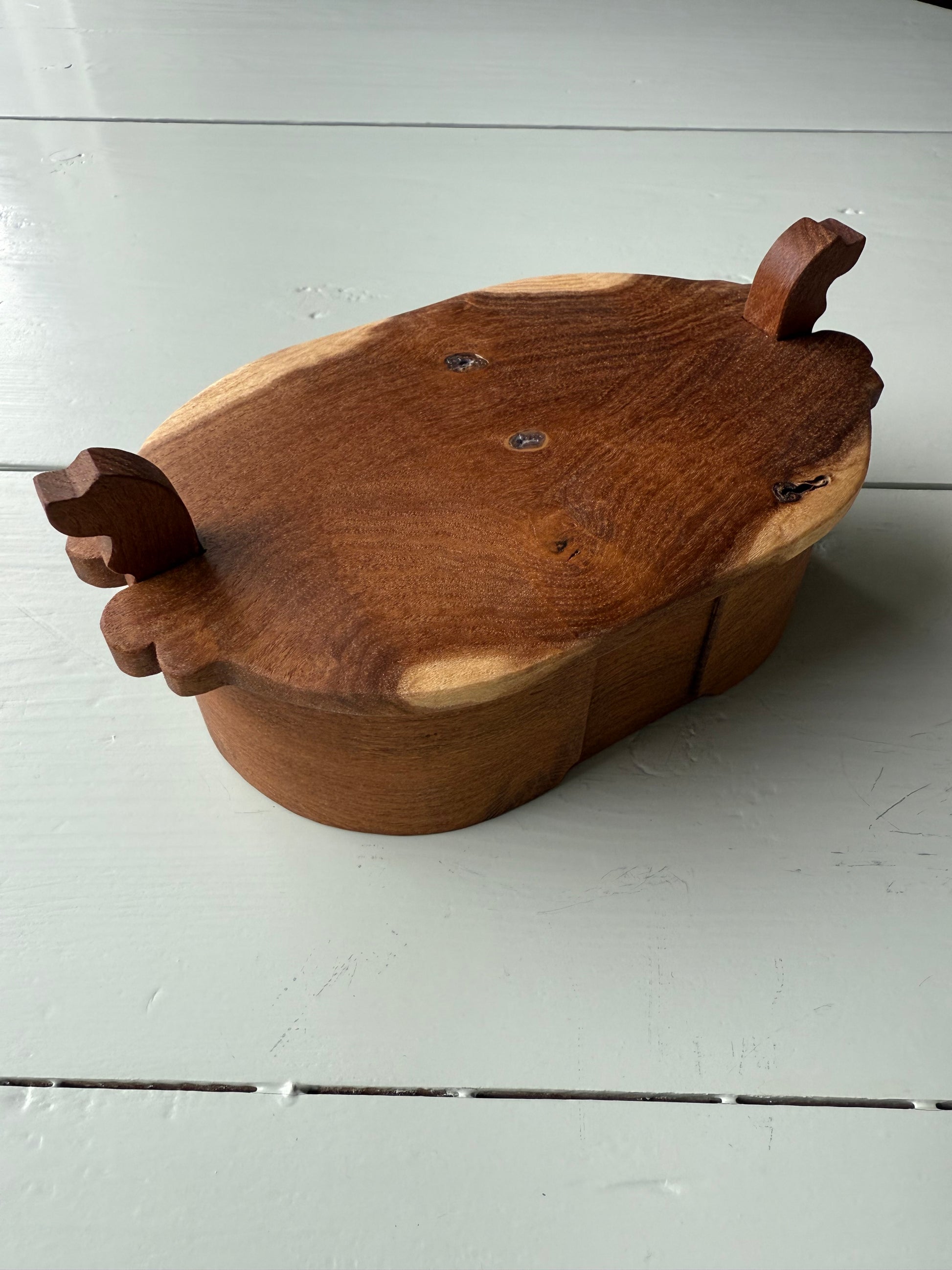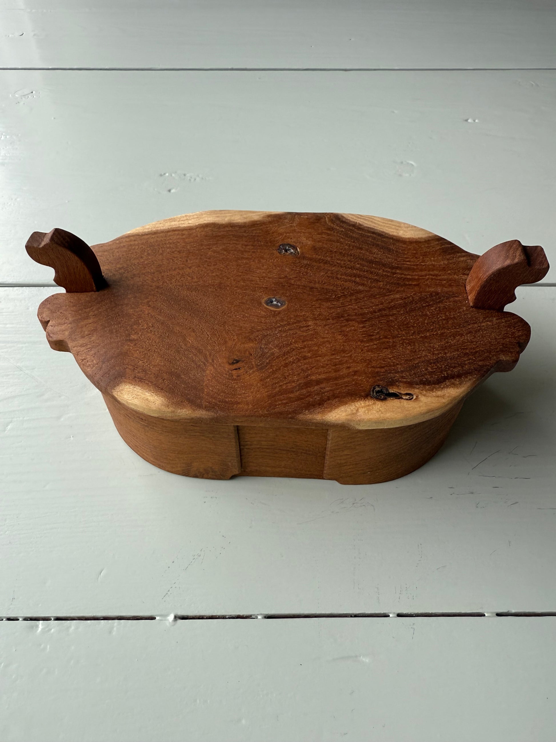 Vakker håndlaget tretine i Morbærtre. Dette er en tine i tre med unike detaljer på selve boksen. Tretinen har et avtagbart lokk, laget og signert vår trekunstner i 2014. Tretinen er 19 cm lang, bredden er 12 cm og høyden 9 cm. Laup i tre er et annet ord for tine i tre, og ble brukt for oppbevaring av matvarer, spesielt smør. Denne vakre tretinen passer perfekt til å oppbevare bunadsmykker, knapper eller som et vakkert interiør-element.